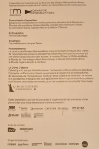Peintres de la modernité, les Impressionnistes livrent leur vision de la société de la fin XIXe siècle. Nombre de leurs œuvres présentent des scènes de vie où femmes et hommes sont vêtus selon les dernières tendances vestimentaires, symboles de la vie moderne.Portraits ou scènes de groupe sont pour les peintres l’occasion de traiter de la mode, révélatrice des aspects novateurs de leur époque. Dans la seconde moitié du XIXe siècle, la presse spécialisée, la naissance des grands magasins et les prémices du prêt-à-porter font de la mode un phénomène en permanente évolution et un objet d’étude pour les artistes.Les œuvres des peintres impressionnistes dévoilent çà et là, les silhouettes corsetées des femmes, le chic des parisiennes, les couleurs en vogue, les tenues de style champêtre ou les costumes de ville des masculins. Exposition réalisée au musée industriel de la Corderie Vallois (Réunion des musées de Rouen) dans le cadre du festival Normandie Impressionniste 2020.Pour une visite virtuelle de l’exposition,cliquez ici.La Dame d’Atours a déjà travaillé sur cette thématique et a prêté à plusieurs reprises des pièces de sa collection pour les expositions « Les Impressionnistes et la Mode » présentée au Musée d’Orsay (Paris) en 2012, au château de Candé (Conseildépartemental d’Indre-et-Loire) en 2017, à la municipalité de Gif-sur-Yvette en 2017 et au musée départemental StéphaneMallarmé à Vulaines-sur-Seine en 2019 et de nouveau au musée industriel de la Corderie Vallois (Réunion des musées de Rouen)en 2023.